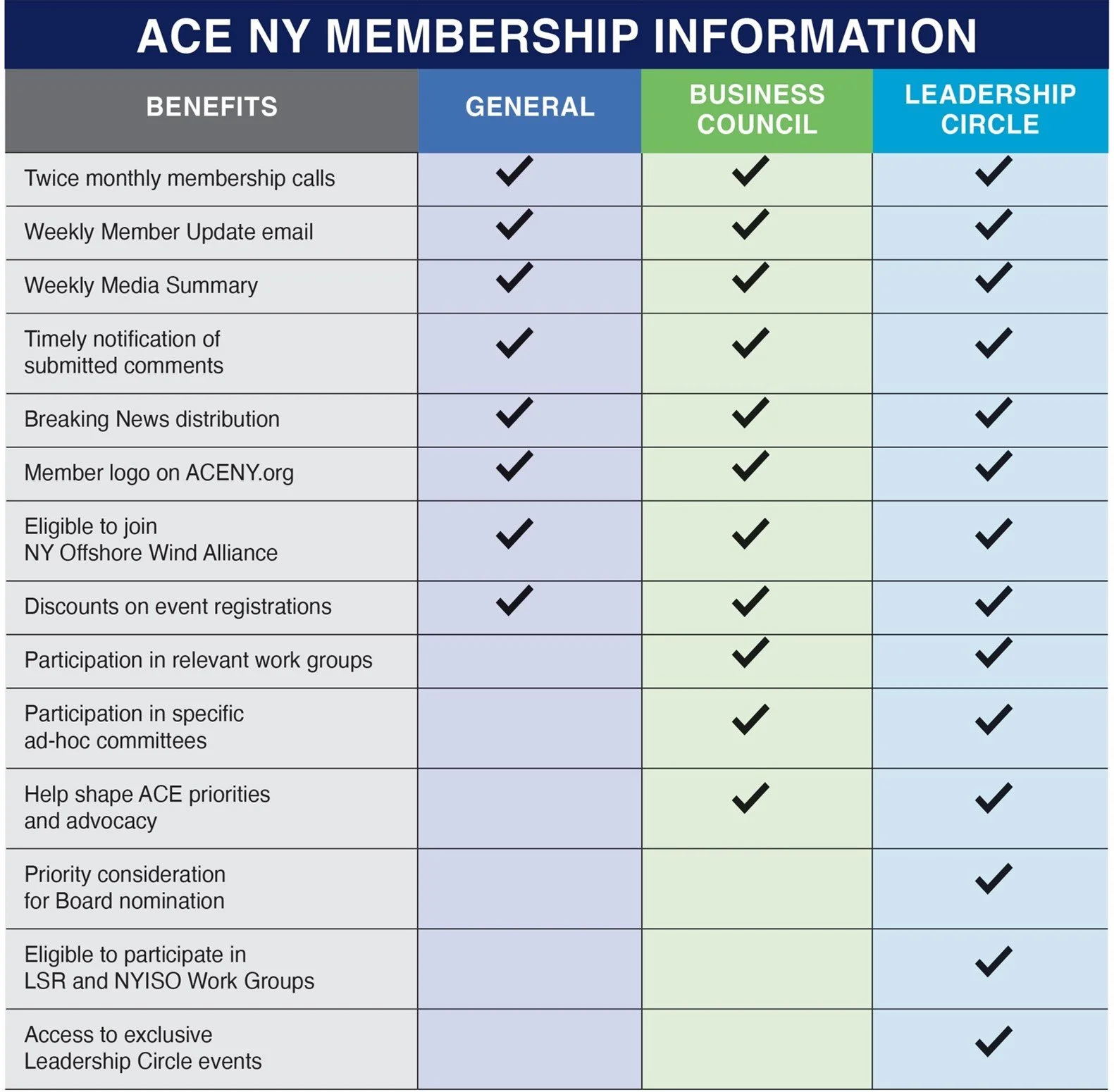 ACE NY membership allows you to take an active, meaningful role in promoting clean energy and creating opportunities for growth in New York’s clean energy economy. Joining ACE NY is an investment in your company’s future: the measure of our success is your success.